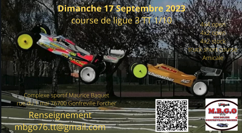 Les inscriptions pour la course de ligue Amicale/Promo/Open au MBGO du 17 septembre 2023 en TT 1/10ème électrique sont ouvertes, les catégories acceptées sont :